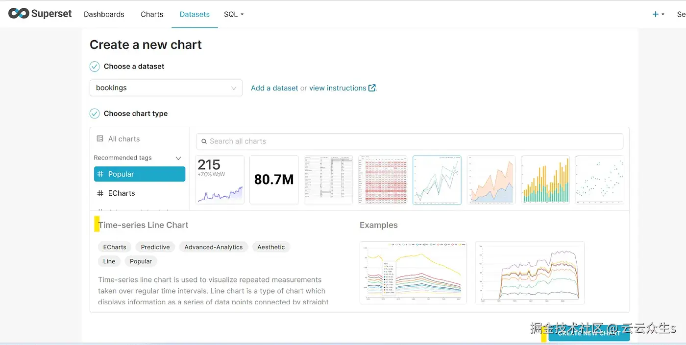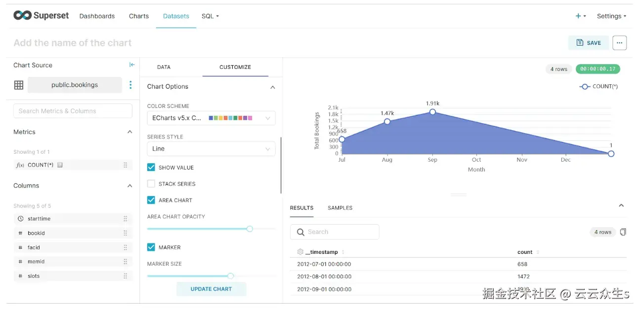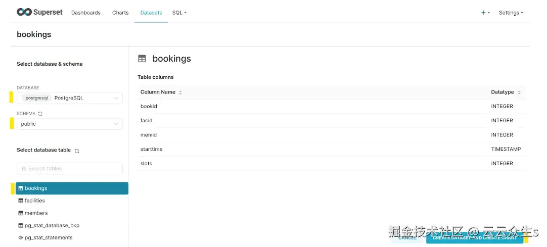 这将带您进入以下屏幕,您可以在其中选择用于可视化的对象。我们使用booking表进行可视化。选择后,选择创建数据集和创建图表按钮。