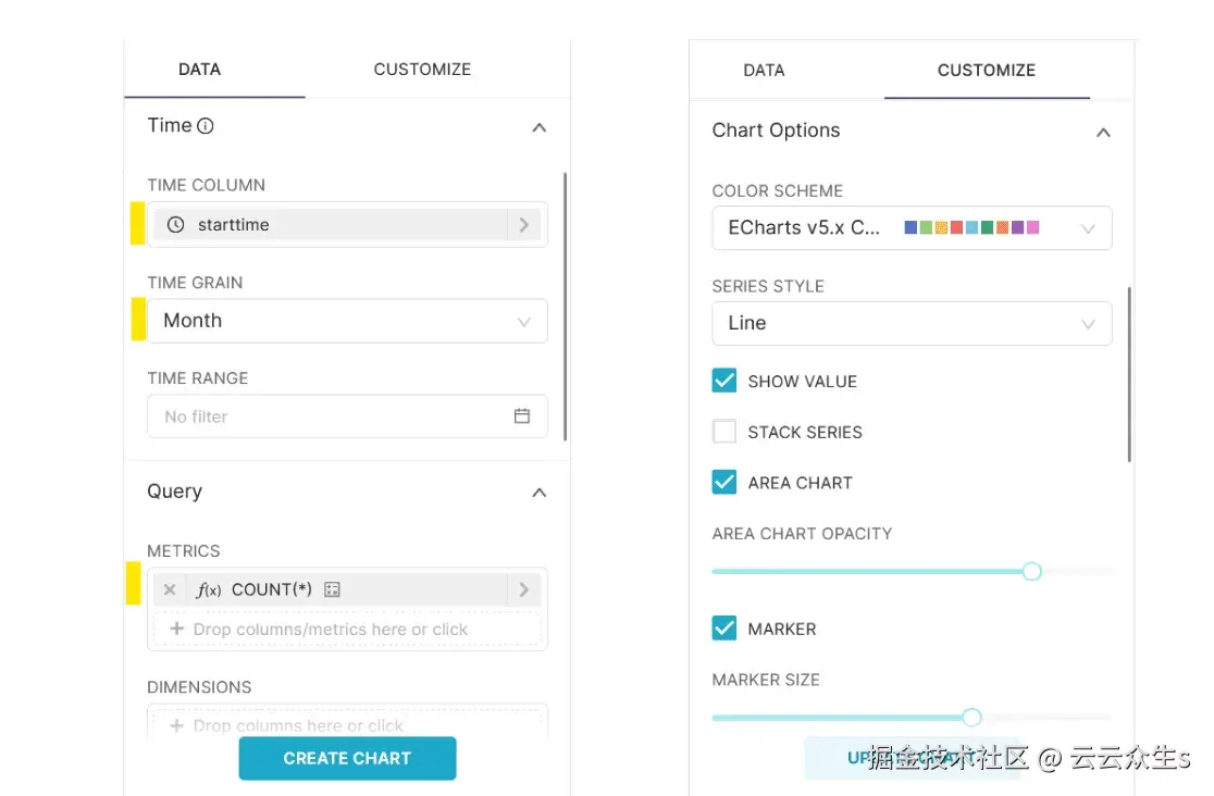 starttime时间粒度 - 指标字段包含要显示的列。在这里,我们可以提供一个聚合列,即COUNT(*) 。