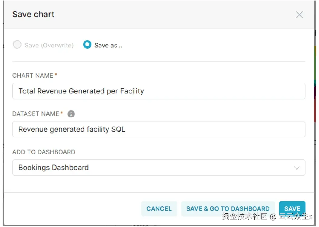 单击保存图表按钮,提供查询的详细信息,并将其保存到我们之前创建的Bookings仪表板。