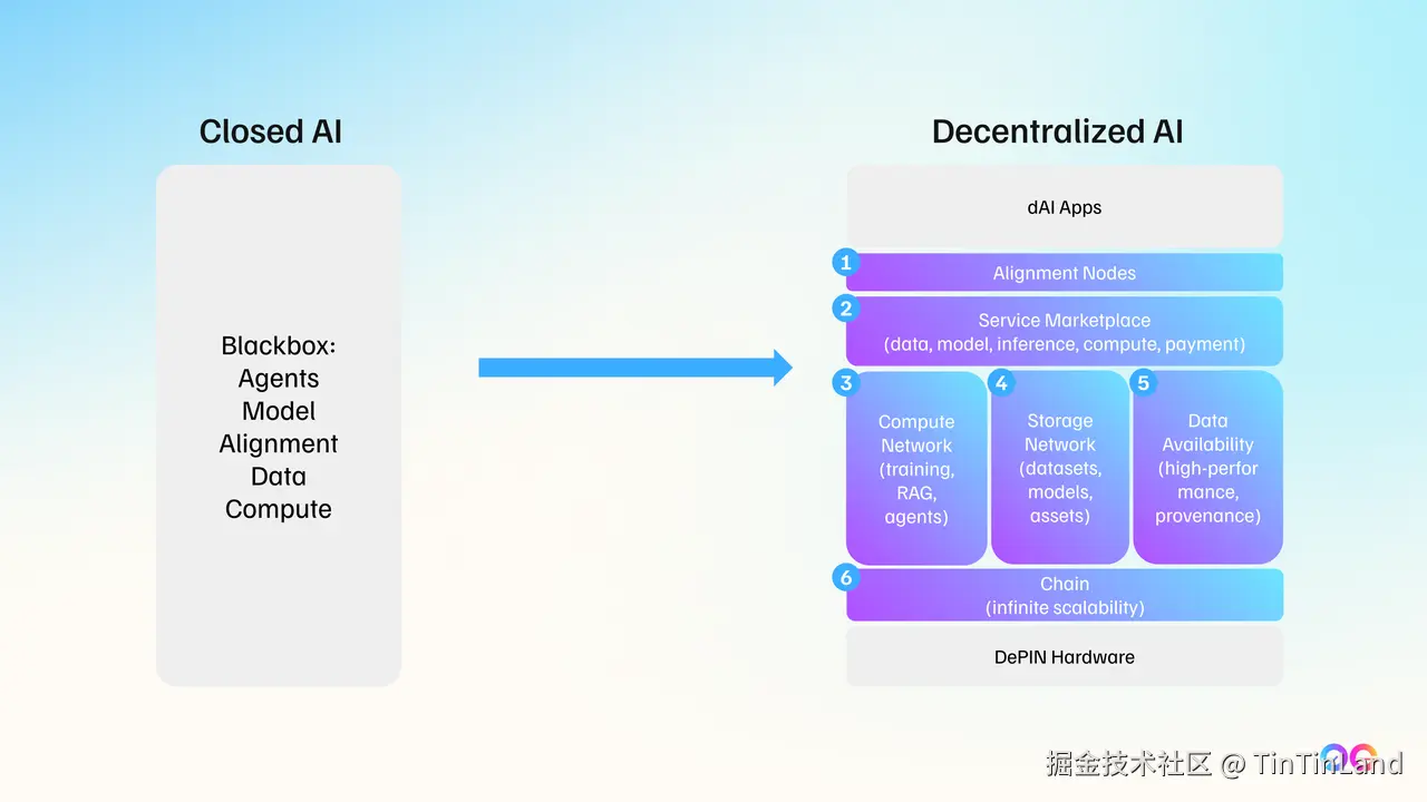 中心化 AI 系统缺乏有效的监督与治理,决策往往由少数人主导,可能会导致与社会价值观的偏离。而去中心化 AI 平台通过集体治理和广泛的开发者参与,推动更包容和创新的 AI 生态。0G 通过提供低成本的计算资源,降低了推理、微调和训练的高成本壁垒,促进全球开发者共同推进 AI 的发展。