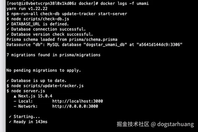 344a33733053 docker.umami.is/umami-software/umami:mysql-latest "docker-entrypoint.s…" 4 seconds ago Up 3 seconds 0.0.0.0:3000->3000/tcp umami