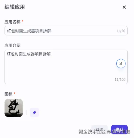 2、创建应用输入你的应用名称和功能介绍,然后点击图标旁边的“生成图标”按钮,系统会自动为你生成一个头像。