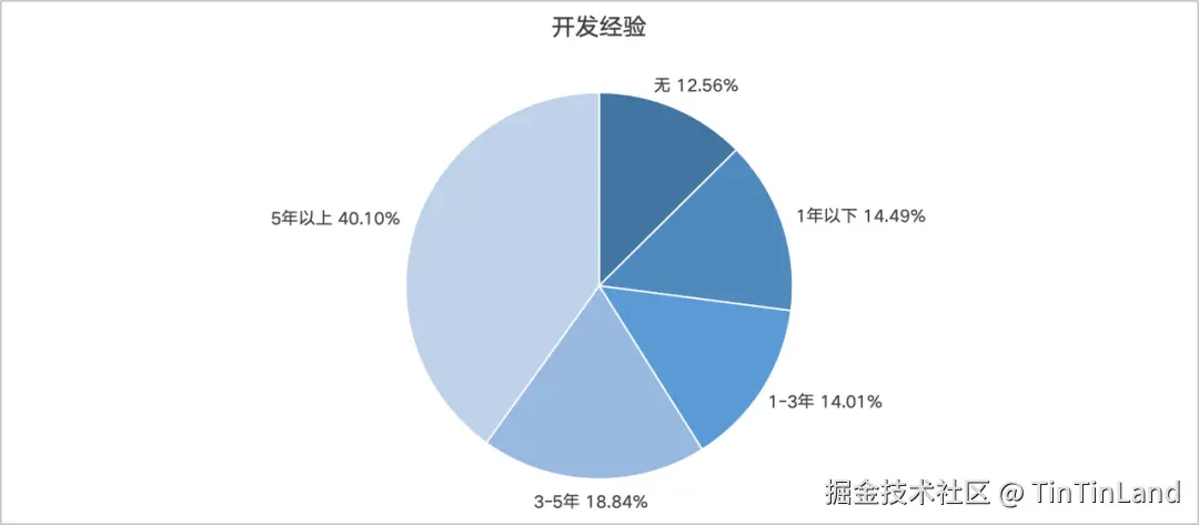 大多数参与课程学习的学员拥有实际开发经验(完全没有开发经验的学员仅占 12%),其中 5 年以上开发经验的学员占比最多,达 40% 以上;3-5 年实际开发经验学员占比为 18% 左右;1-3 年开发经验学员占比约为 14% ,坚实的开发经验基础为课程学习探索奠定了基础条件。