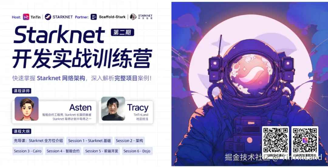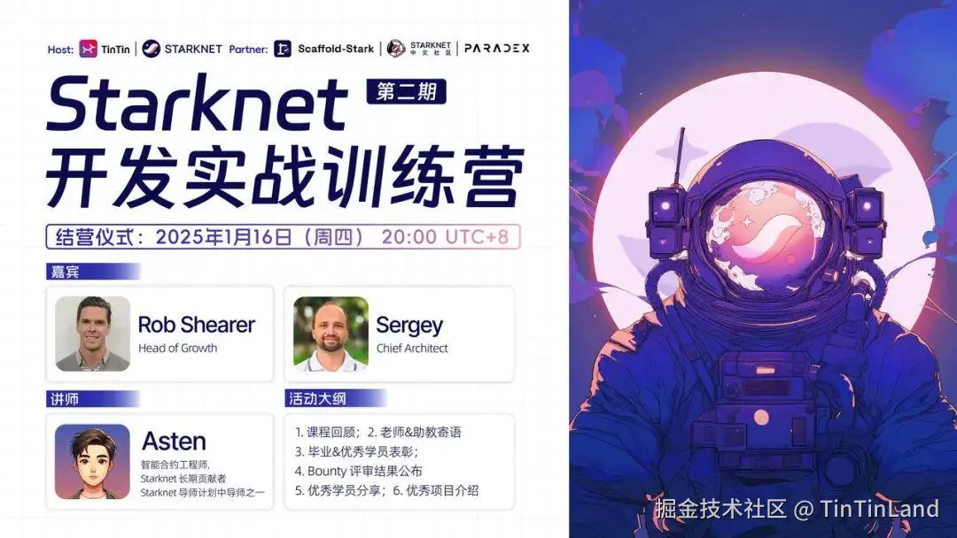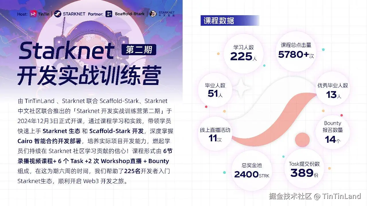 由 TinTinLand 、Starknet 联合 Scaffold-Stark、Starknet 中文社区联合推出的 Starknet 开发实战训练营于 12 月 3 日开课,共计 225 名学员积极报名,课程视频观看量突破 5,000+ 次,最终共有 51 名学员毕业,13 名学员通过 Bounty 比拼提交 14 项作品! 智能合约工程师、Starknet长期贡献者 Asten 作为课程讲师,带领开发者快速掌握 Starknet 网络架构,深入解析完整项目案例。目前课程已于 1 月 16 日举办结营仪式,更有优秀项目在结营仪式上分享开发心得体会,现在就让我们来回顾本期精彩课程的记录!