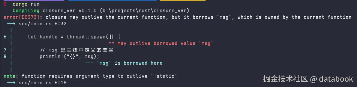 不过,这样,主线程中就无法使用变量msg了,比如在main函数的最后打印msg,会报错,因为它的所有权已经转移到线程中了。