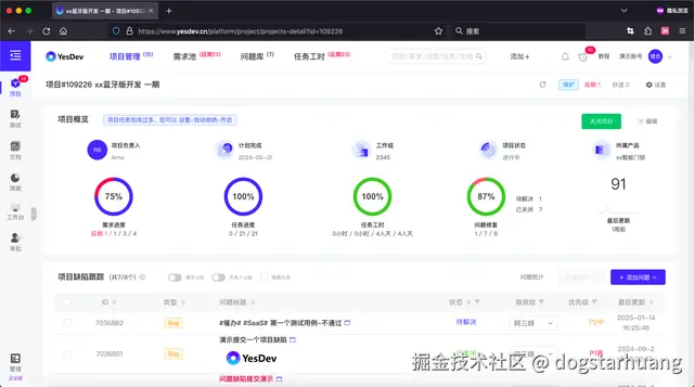 如上图所求,不重复贴图了。每个项目的概览中,有:项目需求进度(目标)、项目工时进度(时间)、项目任务进度,以及项目问题修复进度(质量方面)。为什么需要关注这几个维度的进度呢?因为 项目是目标需求,以及为之需要完成的任务、投入的工时和需要解决的问题的集合。不能顾及失彼,更不能只见树林,不见森林。