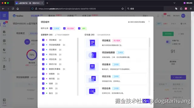 除了项目概览外,当你需要管理项目的其他方面时,你可以通过 “更多组件” 调出你需要用到的项目能力和管理模块,还可以根据自己的项目偏好,调整组件先后顺序,让团队和项目组的关注点都统一集中在管理者认为最为重要的环节。例如研发阶段侧重进度和交付,维护阶段侧重响应和服务、故障统计。