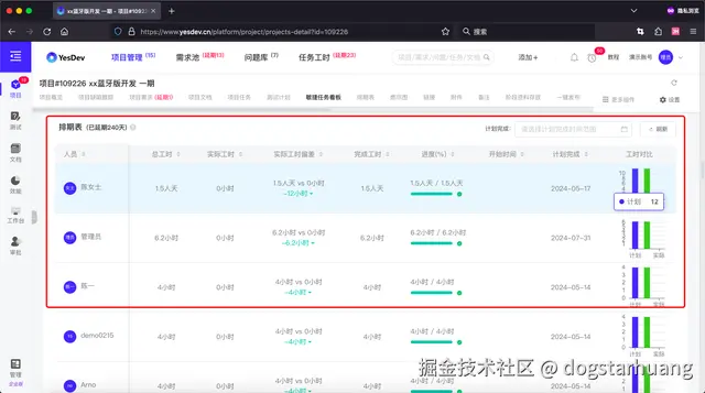 在项目排期表,可以看到根据负责人、人员拆解下来的项目进度和计划。可以看到为了完成这个项目,每个人员需要投入多少时间、工时、工作量,以及每个人当前完成的情况如何,谁滞后、谁进度超前。以及在完成项目后,也可以进行工时的复盘,对比每个人实际投入到项目的工时,和评估的工时之间的差异,不断优化研发工时的使用。不浪费、不阻塞、少返工。