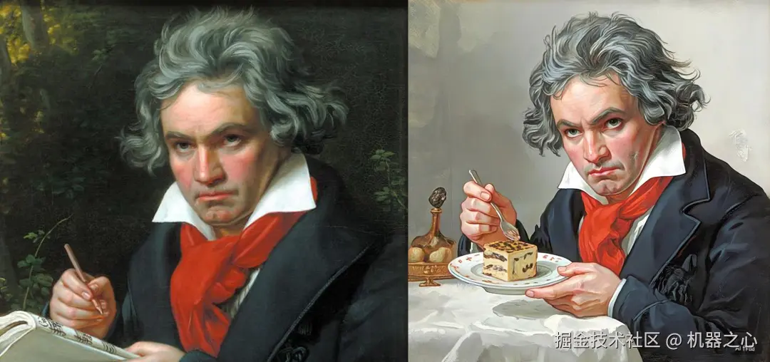 (左为原图,右为生成图。Prompt:生成画一张贝多芬吃虎皮蛋糕的图片。)