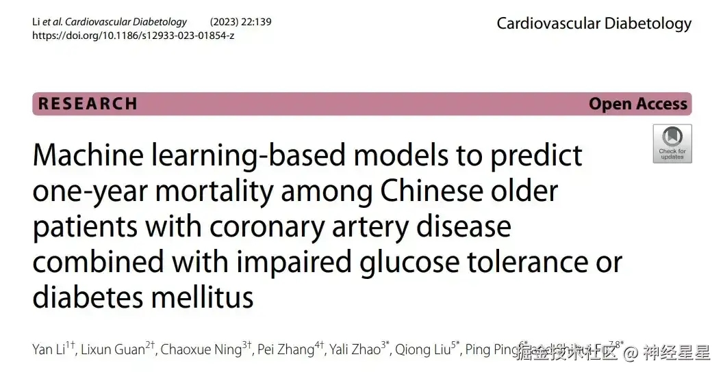 29 论文题目:Machine learning-based models to predict one-year mortality among Chinese older patients with coronary artery disease combined with impaired glucose tolerance or diabetes mellitus, 2023.06