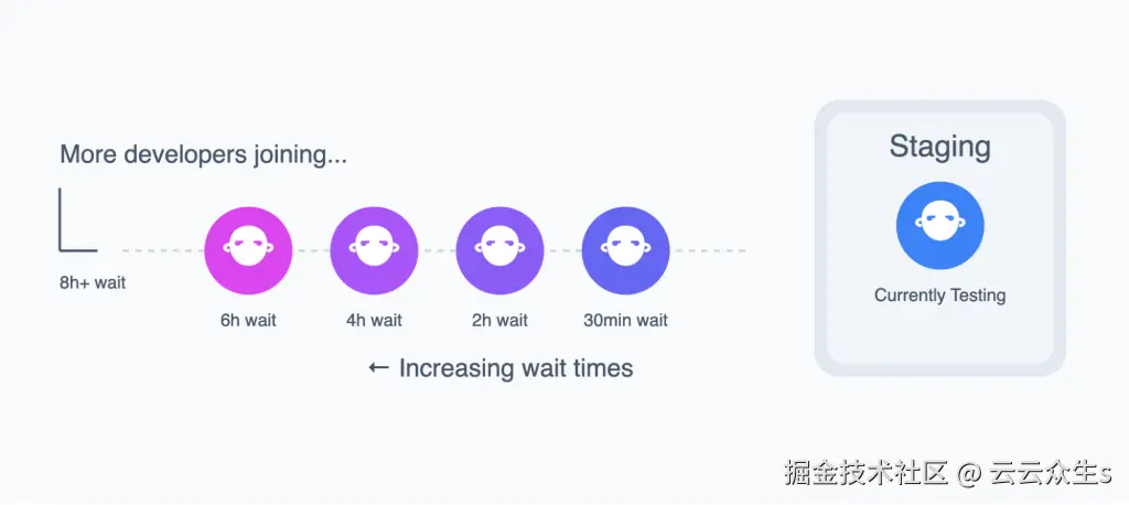 就在上周,我与一家快速发展的安全公司的一位工程总监交谈。其由50名工程师组成的团队实施了一些让我停顿的东西:一个供开发人员在预发布环境中进行测试的注册系统。是的,你没看错:工程师们不得不排队轮流部署和测试他们的代码更改。到周五下午,积压工作会变得令人沮丧地漫长,开发人员不得不等待数小时才能有机会验证他们的工作。虽然有创意,但这清楚地表明了一个更深层次的问题,我在不断发展的工程组织中反复看到过这个问题。