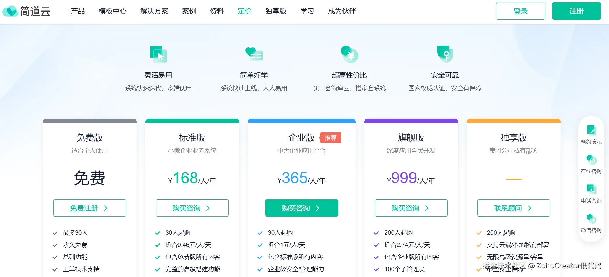 Zoho Creator提供了灵活的定价计划,满足不同类型企业的需求。而且产品提供免费版,可供1位用户使用,提供1款应用的访问权限、250MB存储和1000条记录。您可以随时根据需要选择升级为付费计划。