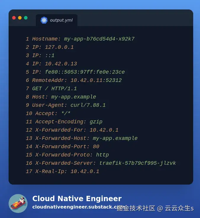 我们将使用名为traefik/whoami的容器镜像,它将HTTP请求的内容及其所有标头和参数作为输出返回。