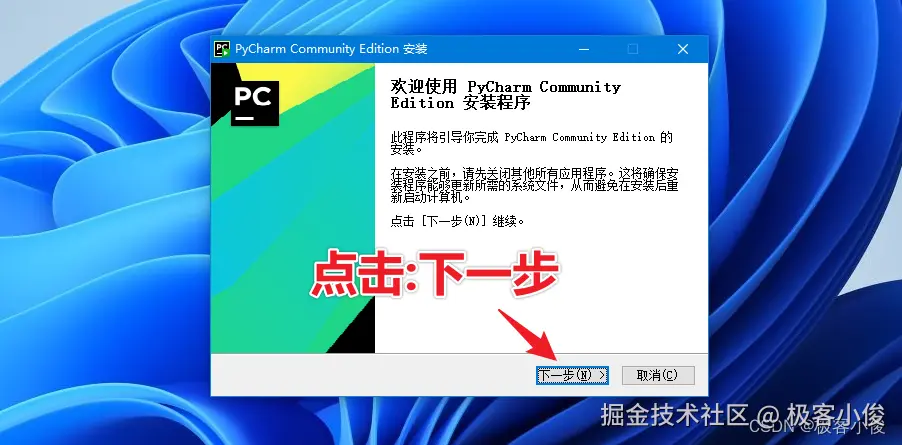 我们首先双击pycharm-community-2023.3.1.exe安装包文件, 会弹出以下对话框
