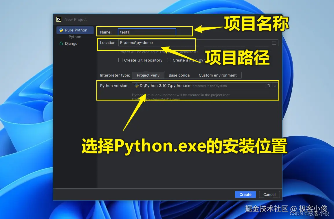 然后在弹出的对话框中,填写项目名称和指定项目路径文件夹,以及在Python version中指定Python的安装目录,找到Python.exe解释器