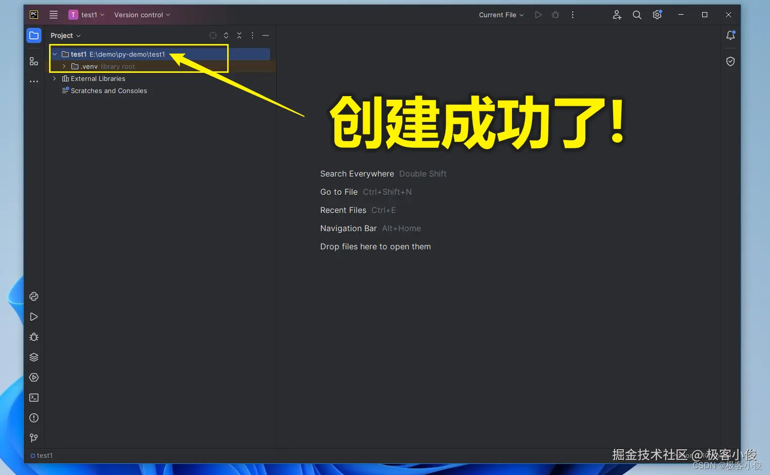 然后点击Create新建项目, 稍等片刻...我们名为test1的项目就创建成功了