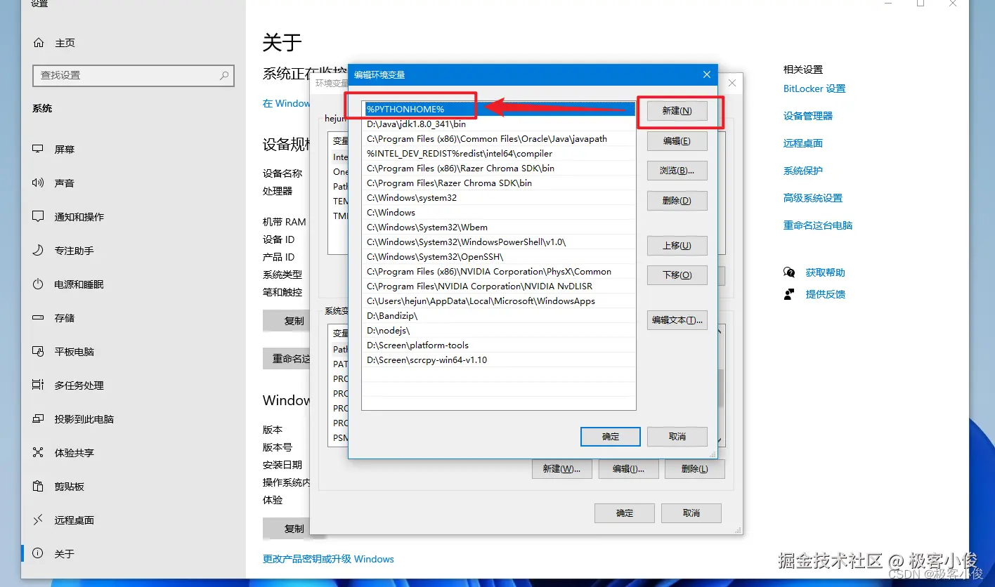 点击新建 输入:PYTHONHOME和安装路径, 然后确定