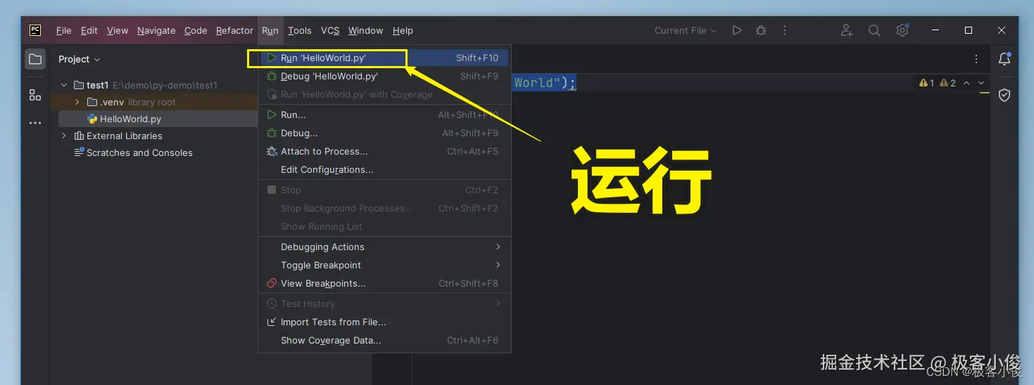 然后点击菜单栏中的Run-->Run HelloWorld.py命令运行程序代码!