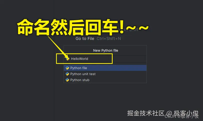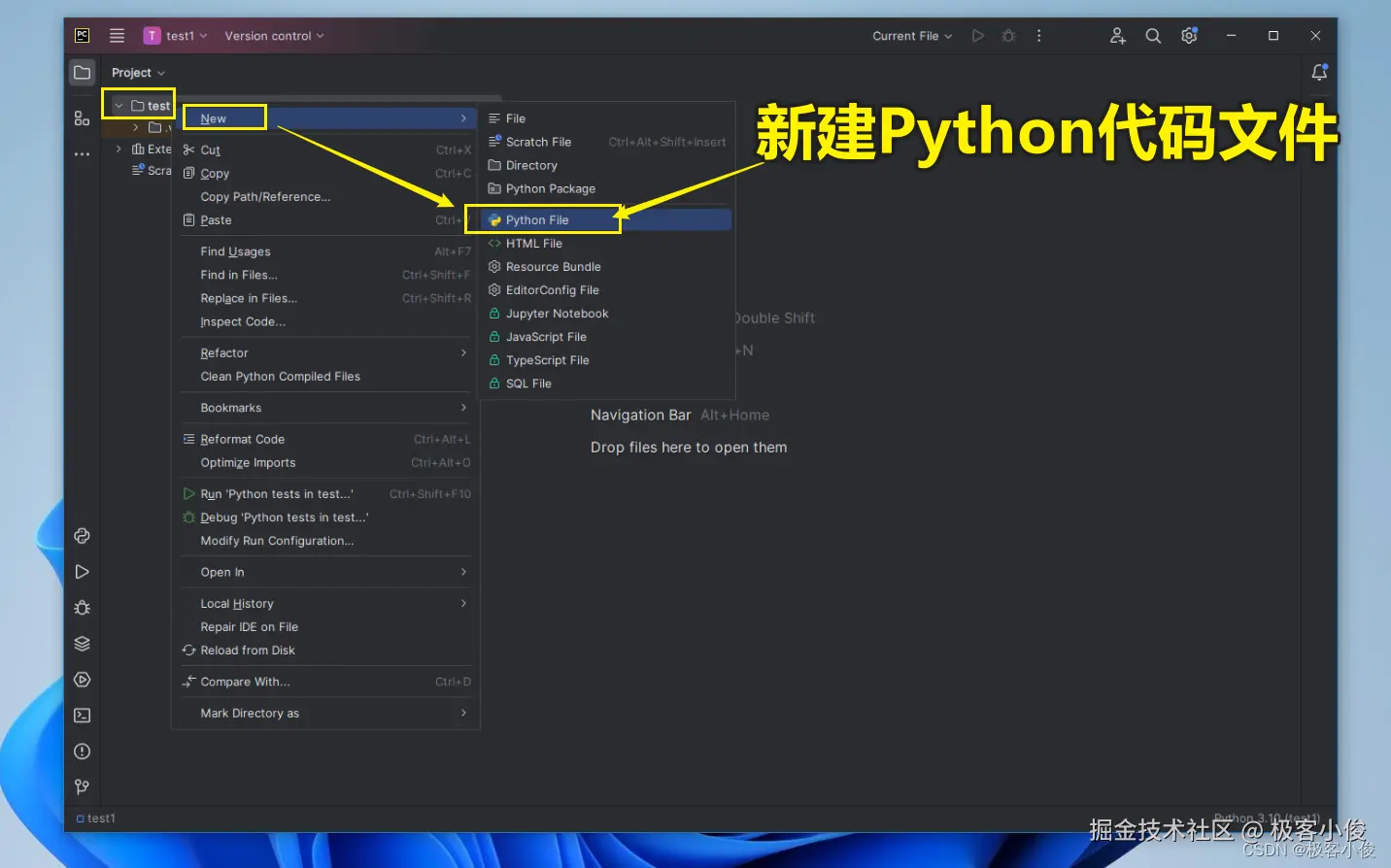 我们可以选中当前项目名称test1,然后点击鼠标右键选择New, 然后选择Python File 来在项目中新建一个Python代码文件,这种文件的后缀名为.py