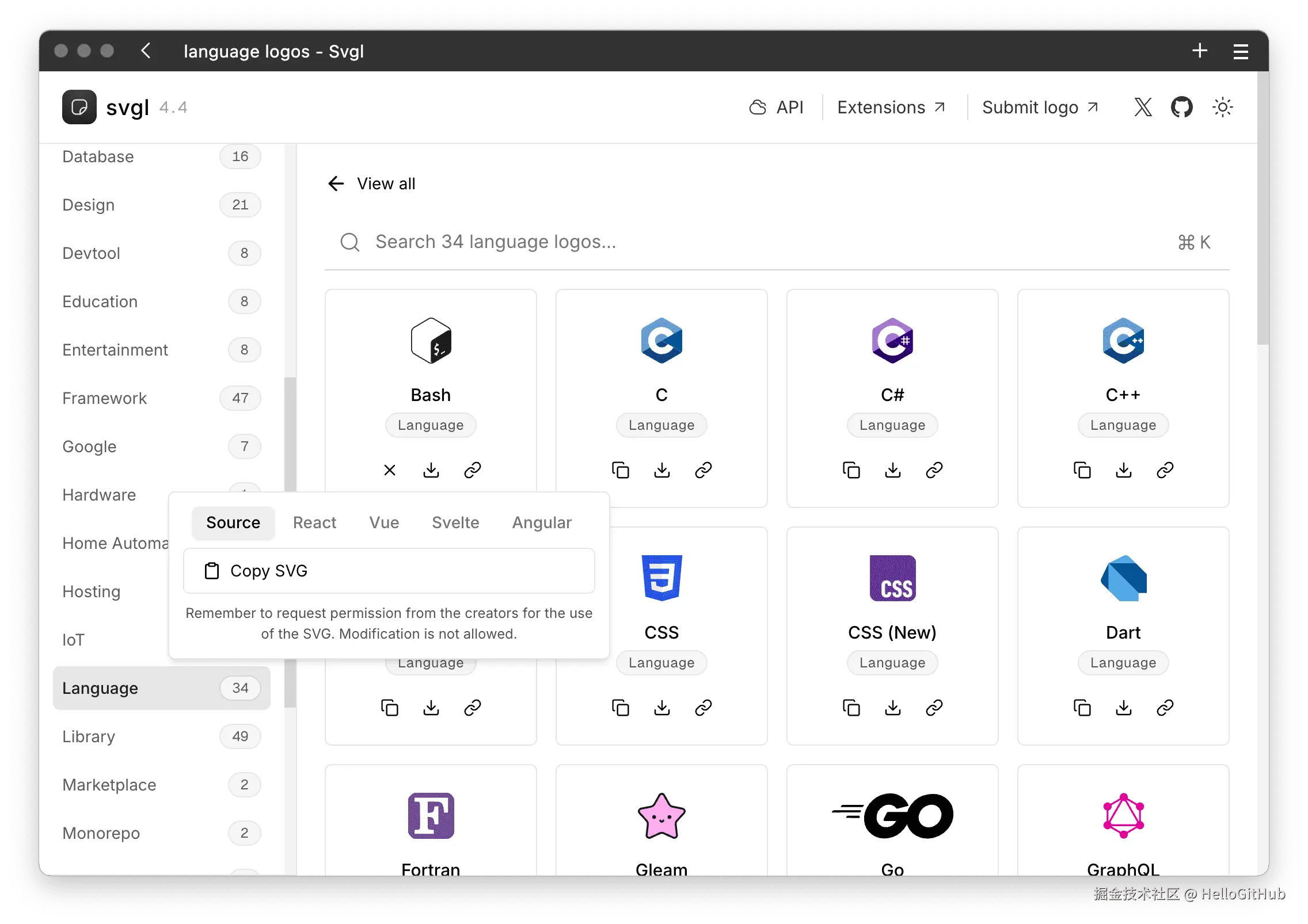 18、svgl:精美的 Logo 资源库。该项目是基于 SvelteKit 和 Tailwind CSS 构建的在线 Logo 库,收录了 400 多种标志和文字商标,覆盖技术、编程语言、框架、公司等分类,支持一键下载和复制代码。