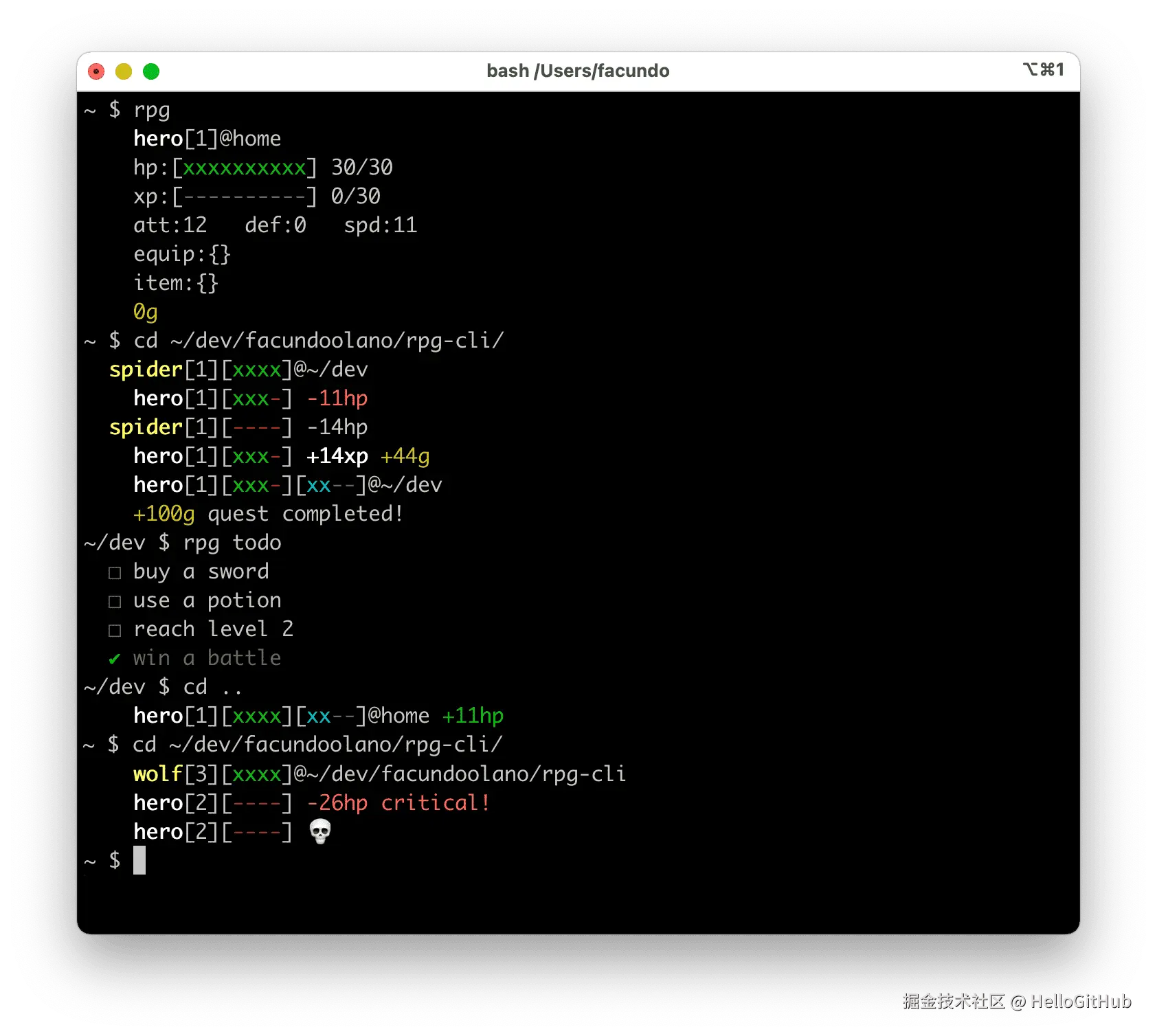 28、rpg-cli:将你的文件系统变成一个地牢游戏。这是一款用 Rust 编写的命令行 RPG 游戏,每次执行 cd 命令时,都可能遭遇敌人并触发回合制战斗(自动),游戏支持角色升级、物品、职业和宝箱等功能。