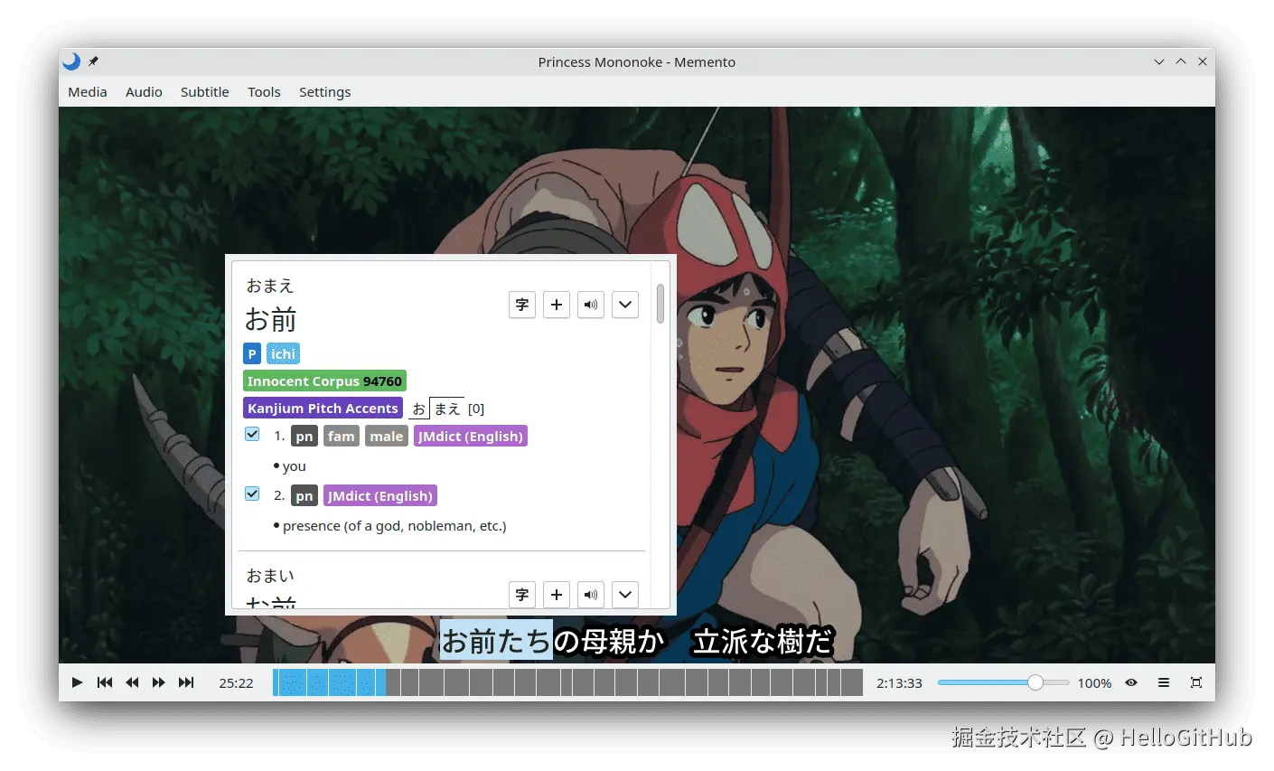 4、Memento:边看视频边学日语的视频播放器。这是一款基于 mpv 的开源视频播放器,专为学习日语而设计。它能够帮助用户在观看视频时学习日语,支持弹出式词典、字幕浏览、生成和同步生词卡等功能。