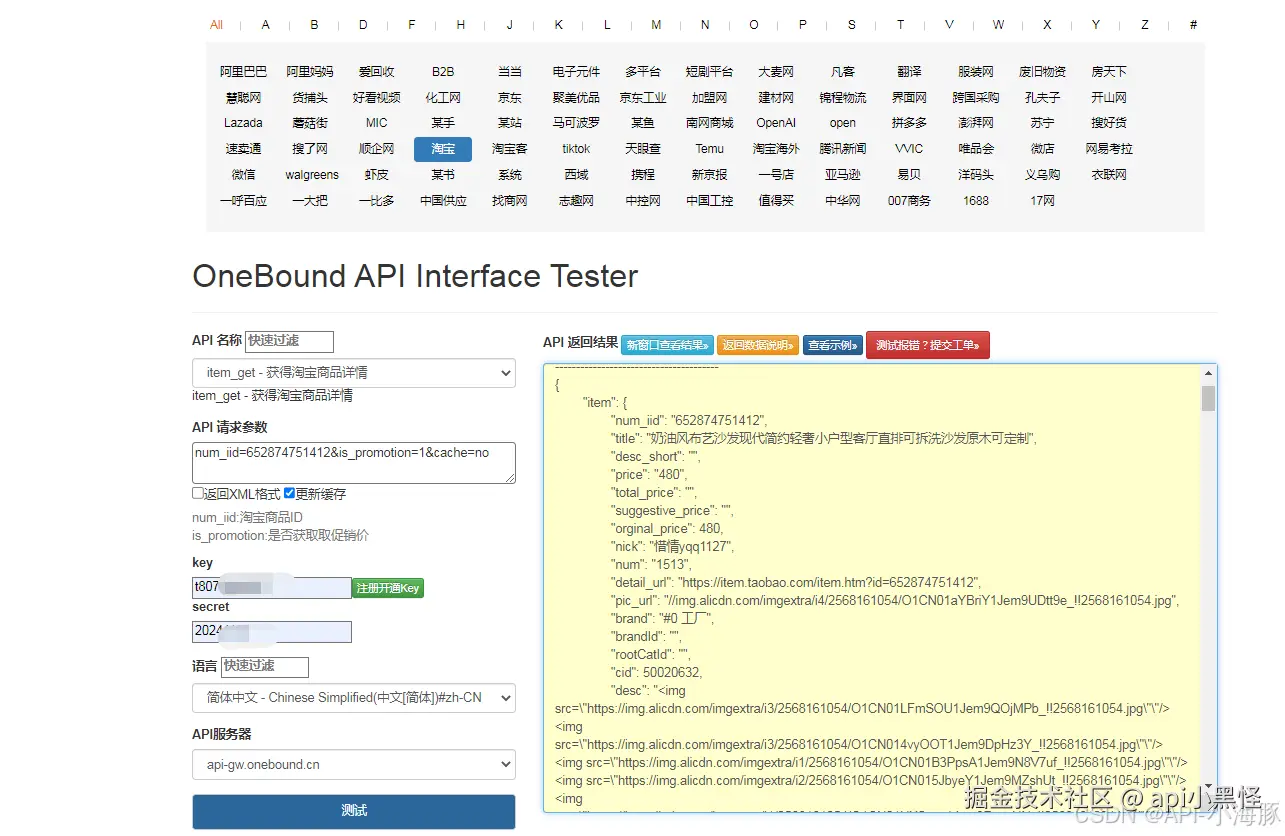 编辑电商平台API接口种类繁多,涵盖了商品、订单、支付、营销、用户等多个方面。以下是一些主流电商平台常见的API接口及其功能概述:获取API KEY测试