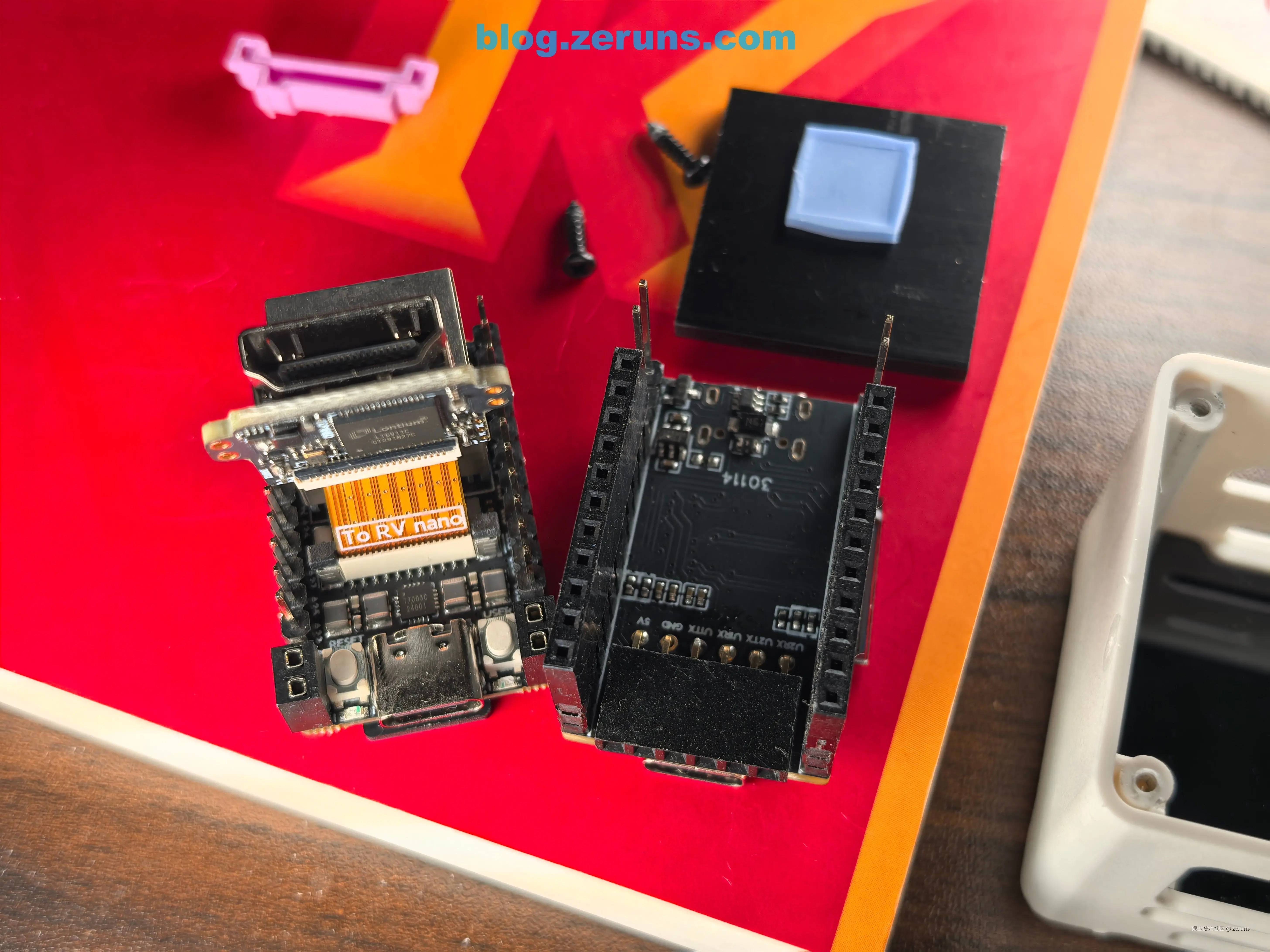 NanoKVM (Full) 拧下底部四颗螺丝取出电路板和散热片,散热片上有导热垫将处理器的热量传导到散热片上,