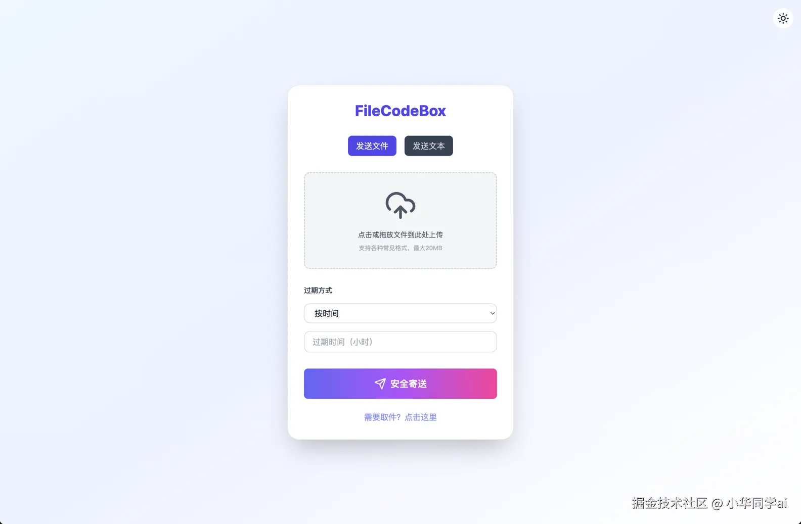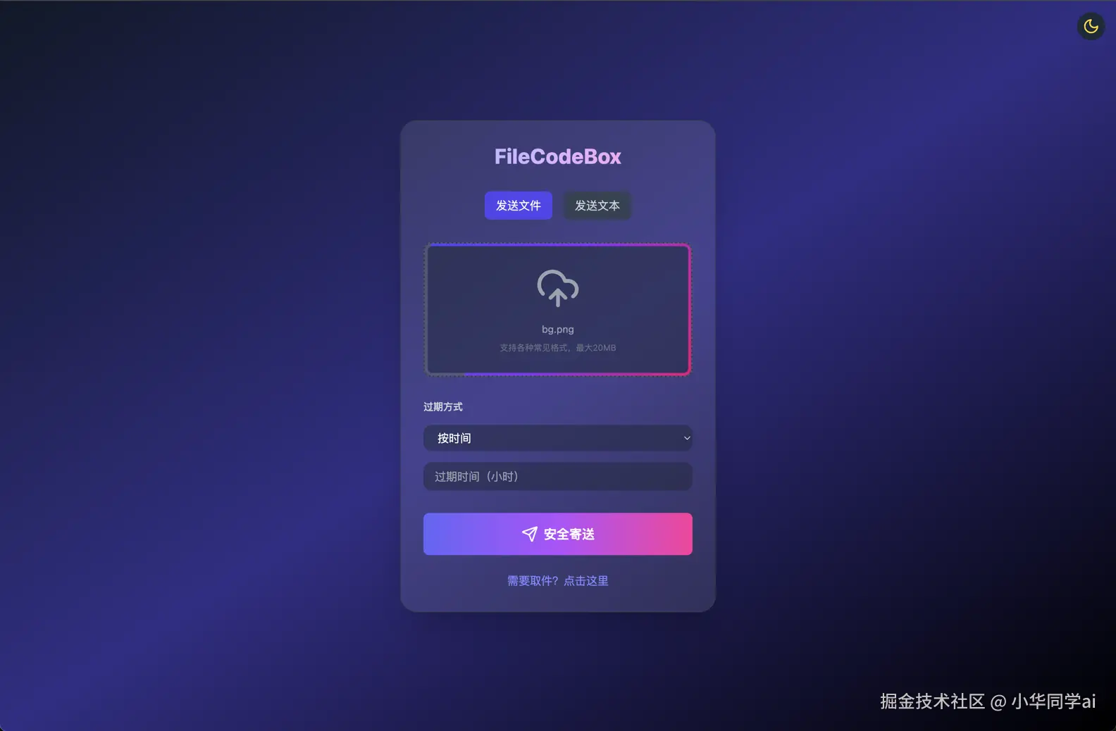 支持设置过期时间的文件存储功能非常实用。有时候我们可能只是临时存储一些文件,过了一段时间后就不需要了。使用FileCodeBox,我们可以设置文件的过期时间,到期后文件自动失效,既节省了存储空间,又保护了隐私。