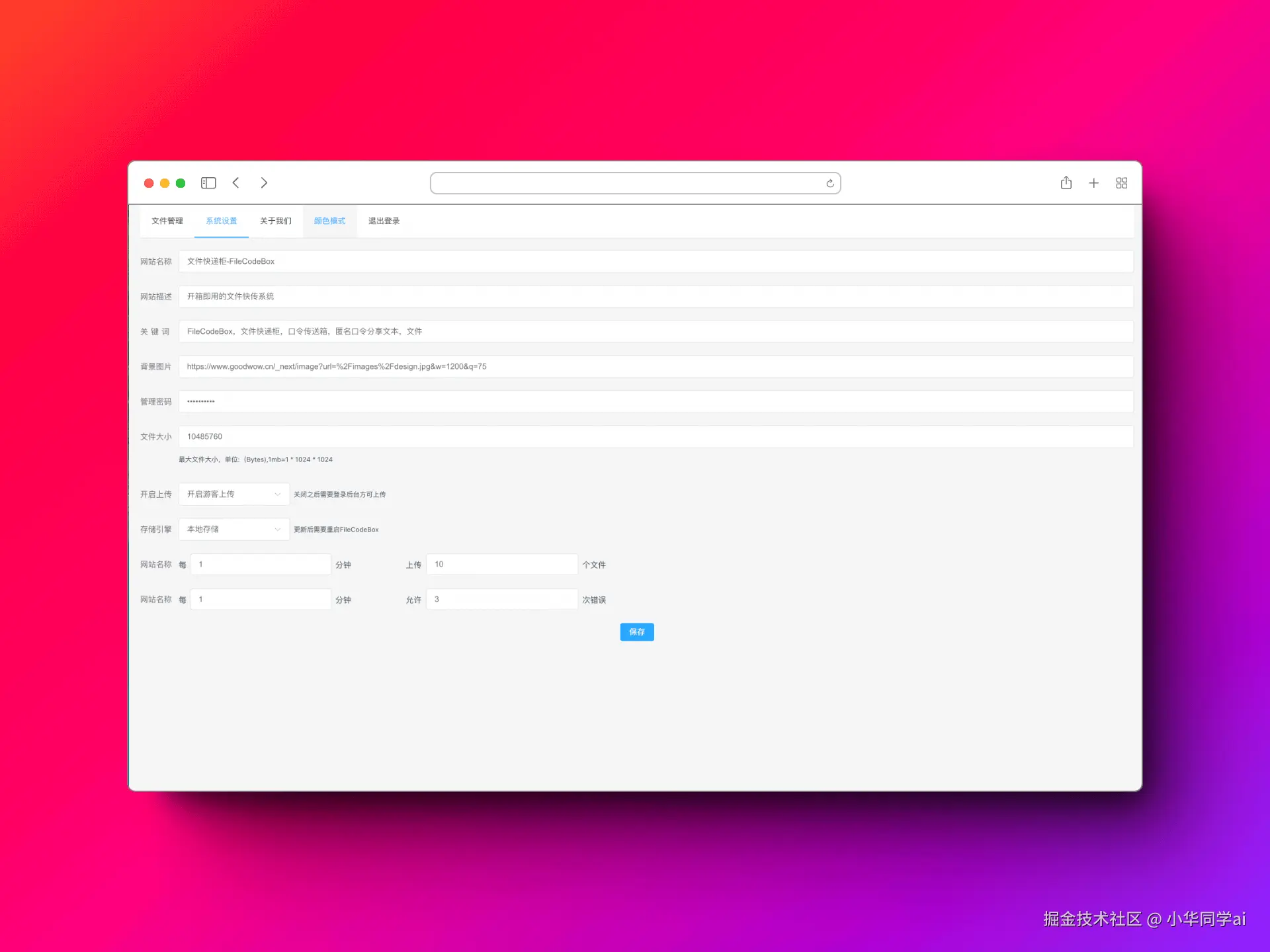 - 系统设置:在这里用户可以对整个FileCodeBox的系统进行个性化设置,例如设置一些安全参数等。