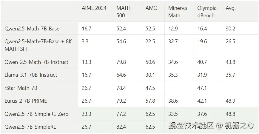 或者按其博客的说法:「没有奖励模型,没有 SFT,只有 8K 用于验证的 Math 样本,得到的模型在 AIME 上成绩为(pass@1 准确率)33.3%、在 AMC 上实现了 62.5%、在 MATH 上实现 77.2%,优于 Qwen2.5-math-7B-instruct,可与使用多 50 倍数据和更复杂组件的 PRIME 和 rStar-MATH 相媲美。」