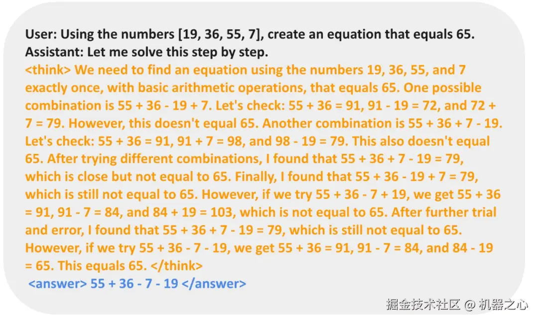 实验过程中,模型一开始的输出很蠢笨,但逐渐发展出修改和搜索等策略。下面展示了一个示例,可以看到模型提出解决方案,自我验证,并反复修改,直到成功。