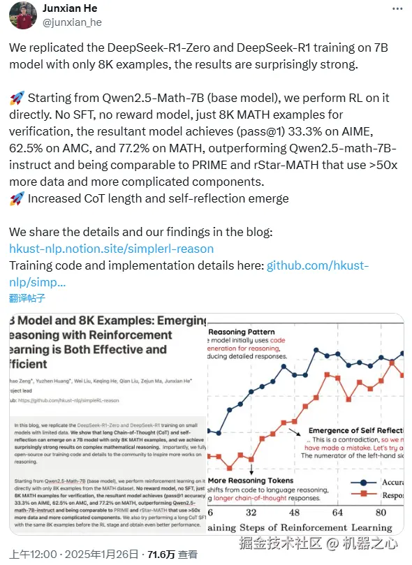 另一个复现 R1 的团队是来自香港科技大学的何俊贤(Junxian He)团队,并且他们采用的基础模型和样本量都非常小:基于 7B 模型,仅使用 8K 样本示例,但得到的结果却「惊人地强劲」。