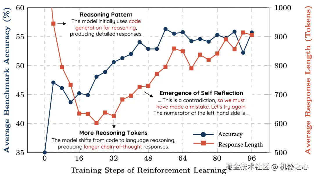需要注意,该团队的这个实现的实验大都是在 R1 发布之前完成的。他们发现,仅使用 8K MATH 示例,7B 模型就能涌现出长思维链 (CoT)和自我反思能力,而且在复杂的数学推理上的表现也非常不错。