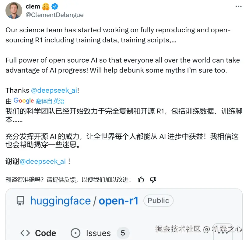 Hugging Face CEO Clem Delangue 的推文