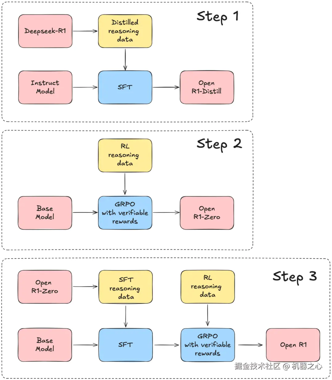 据其项目介绍,Open R1 项目计划分三步实施:
