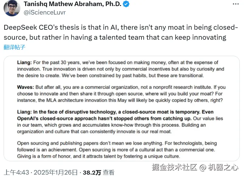 DeepSeek 创始人梁文锋之前接受的采访被翻译成了英文版,正在 AI 社区引发热议