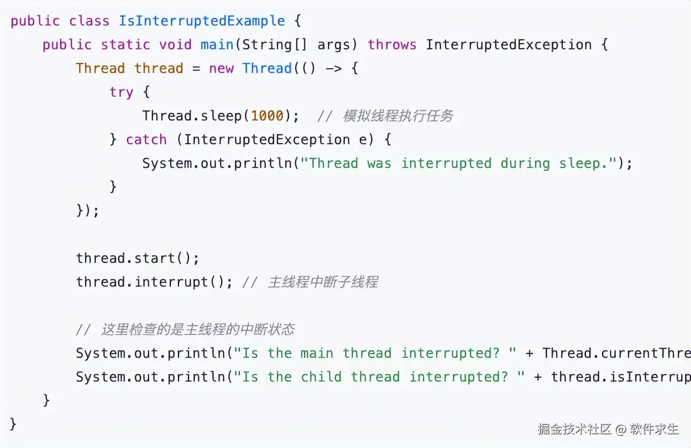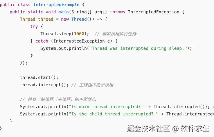 不过,isInterrupted方法并不会清除线程的中断标志。也就是说,调用isInterrupted并不会改变线程的中断状态,它只是查询当前线程的中断状态。