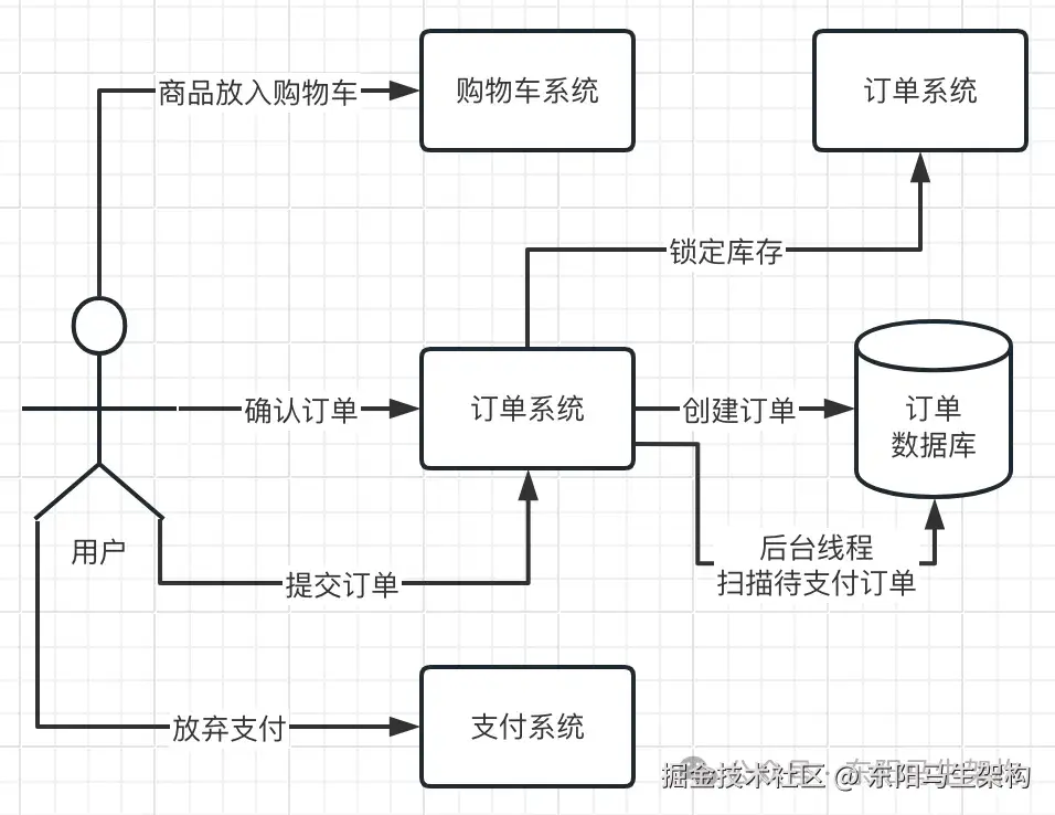 当订单提交到订单系统后,就会在数据库中创建出一个订单,然后就会跳转到支付界面让用户进行付款。但是万一用户在付款界面犹豫了,结果把付款界面给关了。那么就会出现这么一种情况:订单创建了但是没支付,此时订单的状态为"待支付"。而且只要用户提交了订单,订单里涉及到的商品,都会有对应的锁定库存的工作,相当于给用户预先保留好这些商品。订单系统在创建订单时已经调用库存系统锁定了用户要买的商品的库存,结果用户跳转到支付界面后却放弃了支付,如果订单一直不付款,那么它对应的商品库存就会一直锁定,影响其他用户的购买。