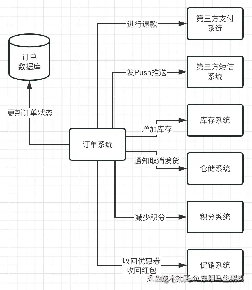 如果用户要退款,此时会涉及公司内部系统的一系列回滚。比如更新订单状态、增加库存、收回优惠券和红包、减少积分,通知取消发货等。而且还要调用第三方支付系统进行退款,万一退款失败,那么可能就会出现订单状态和钱款不一致。
