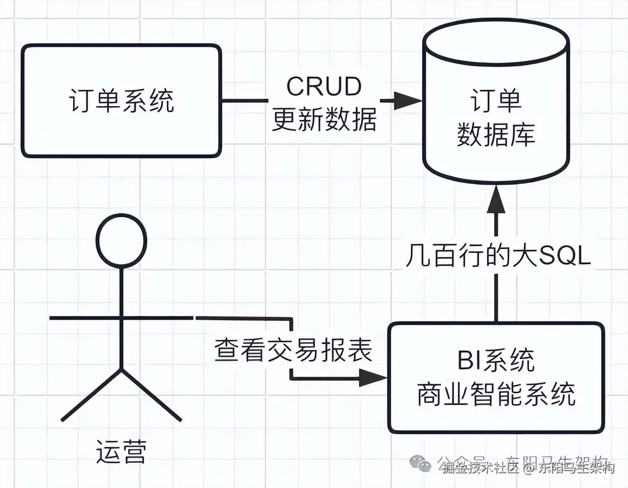 由于目前订单数据库是直接对外暴露的,大数据团队可以直接访问订单数据库。他们有一个数据报表系统,运营每次查看交易报表时,会直接用一个几百行的大SQL,从订单数据库里查数据。