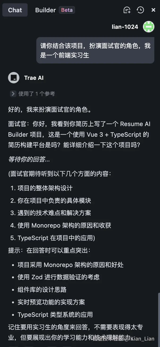 当然它还可以扮演面试官角色,询问你该项目相关的内容