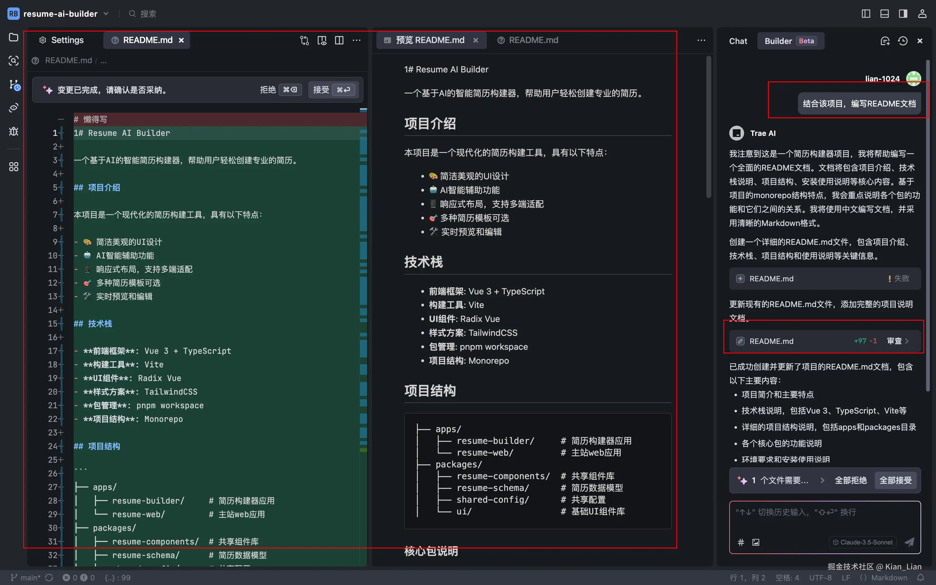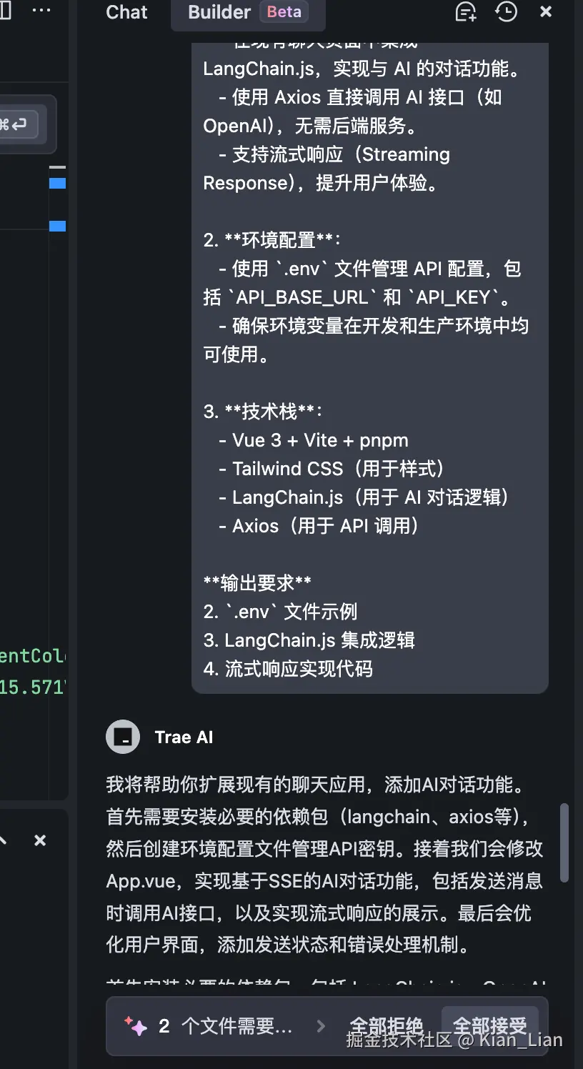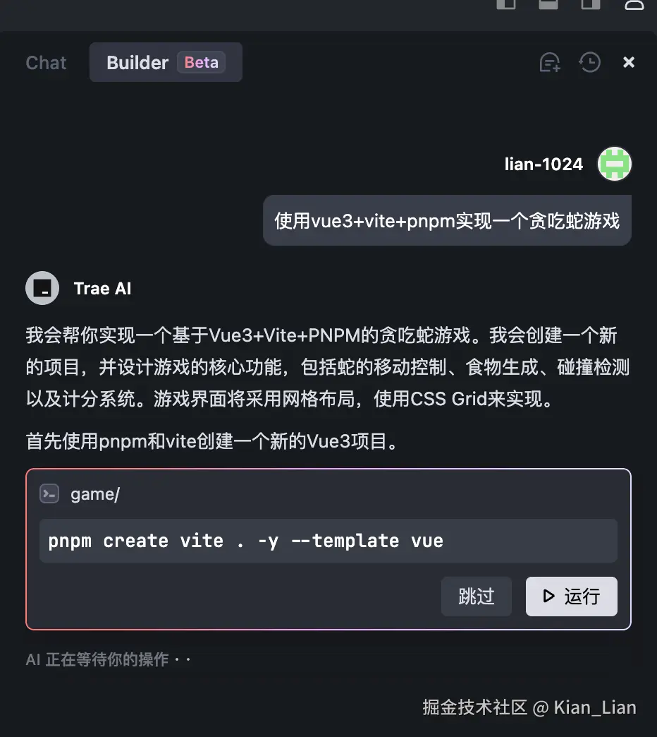 Builder模式可以从0帮你构建一个完整的项目,自动编写代码,在生成的过程中,它也会向你询问一些意见,比如它生成了一行命令它会询问你“是否需要运行这行命令?”,你只需要点击即可