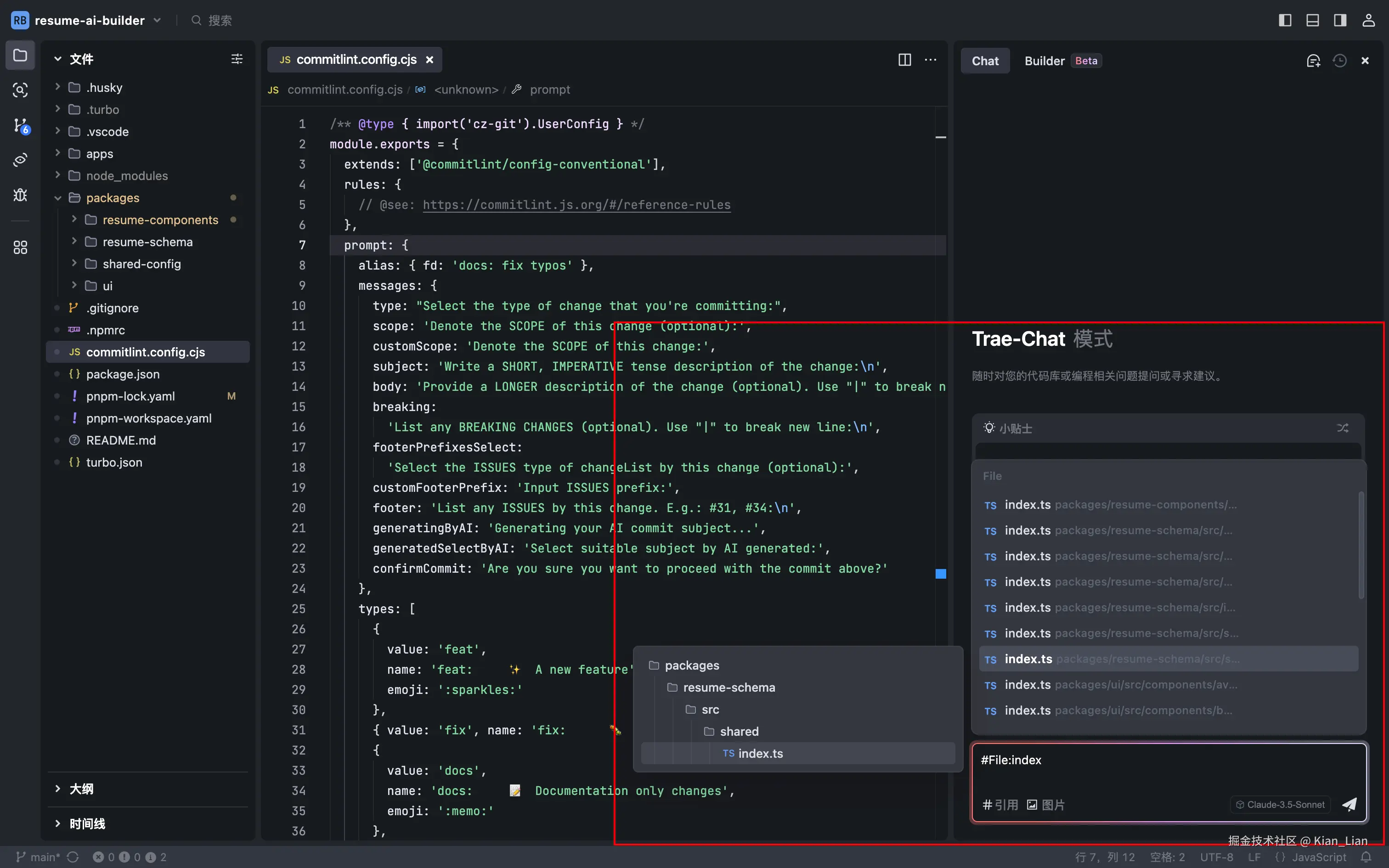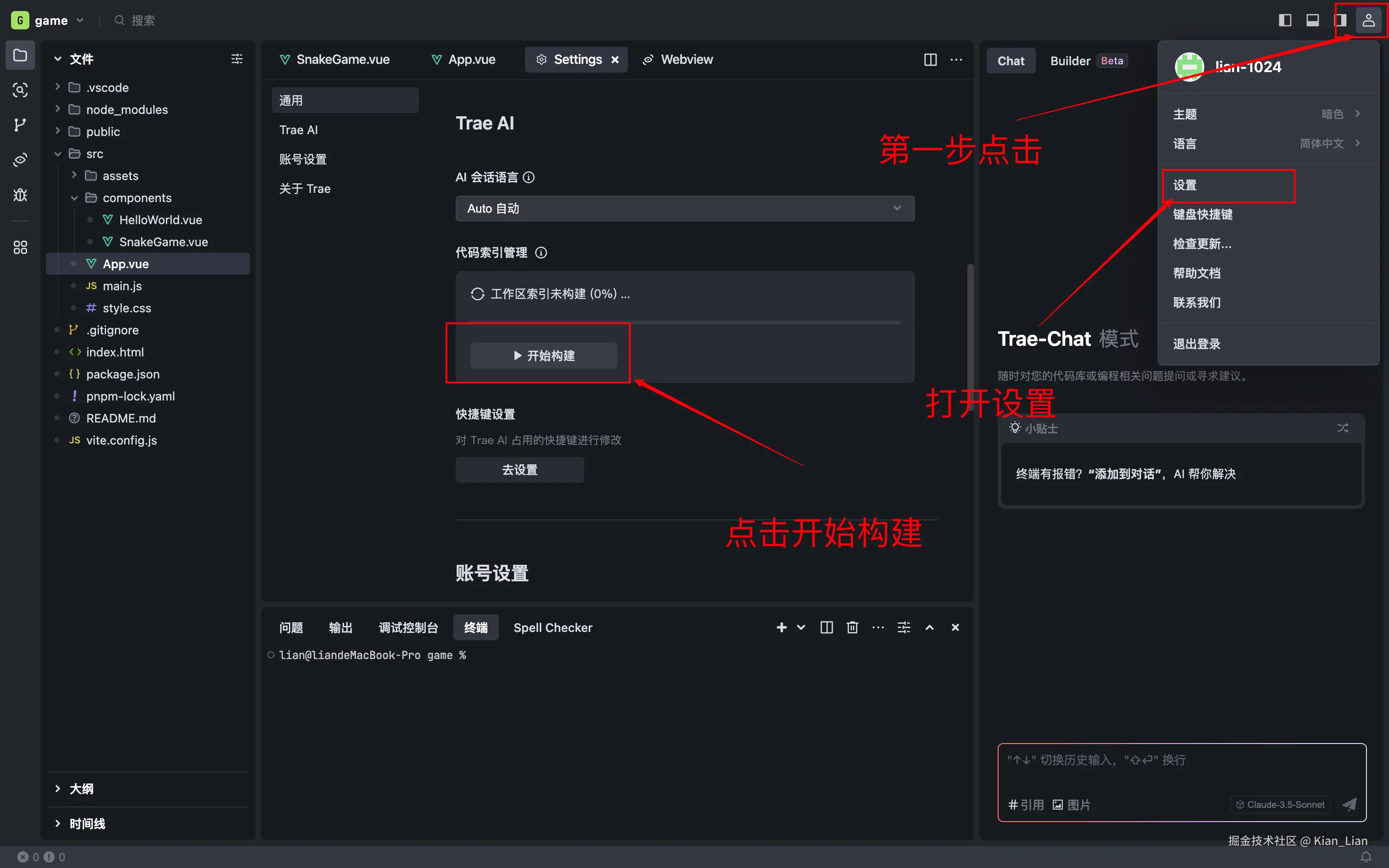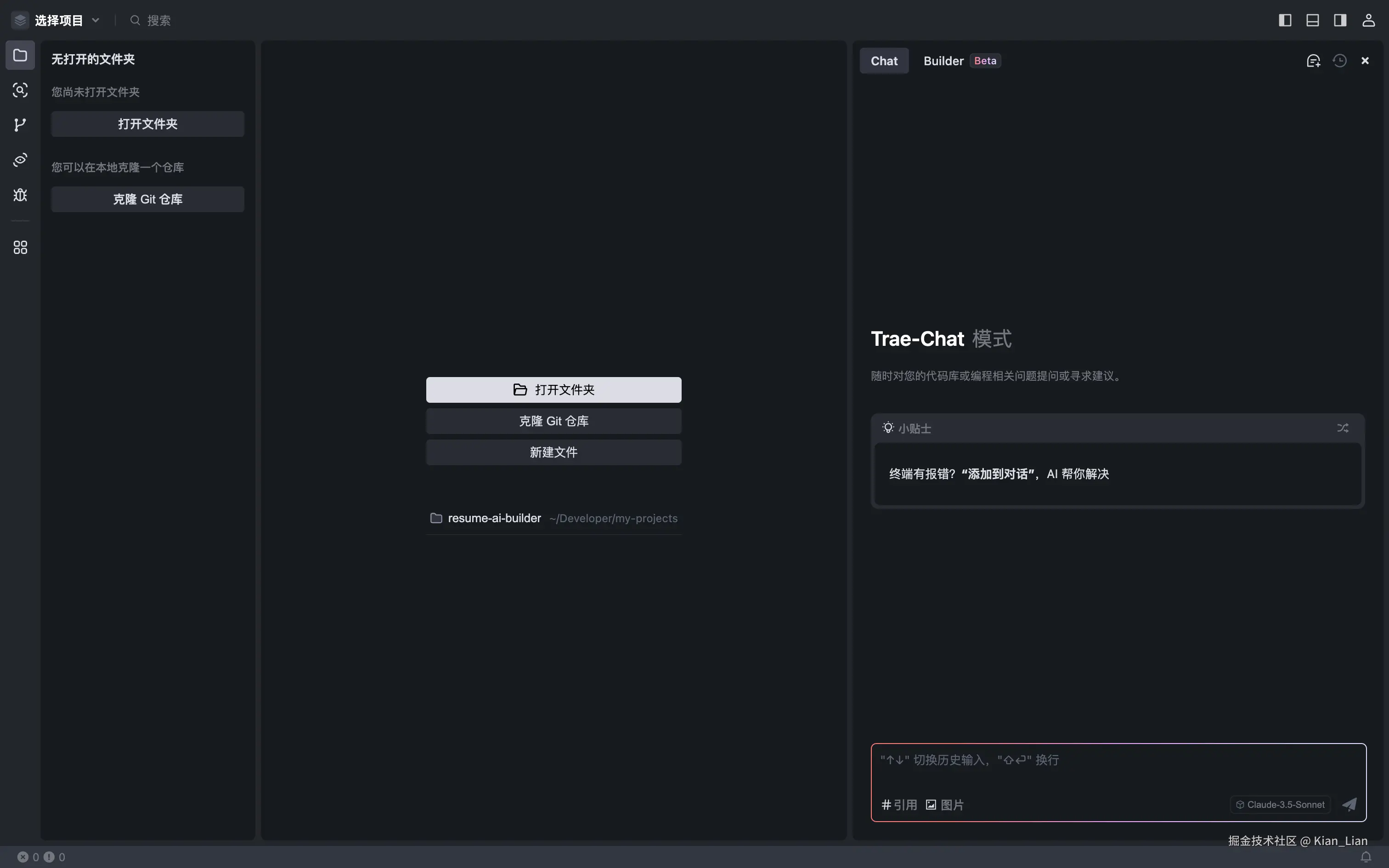 进入 Trae 就可以看得到,典型的布局,左侧文件导航区,中间代码编辑区,右侧是 AI 聊天交互区,不得不说,这个 UI 确实可以,看习惯了 VSCode 以及那些插件的主题,Trae 的 UI 界面很简洁、直观的设计,让人焕然一新Trae的AI辅助功能有两种分别是Chat模式、Builder模式,接下来我会以介绍Trae基础功能的方式介绍Chat模式,之后使用Builder模式入门编写一个贪吃蛇小游戏,最后实战阶段