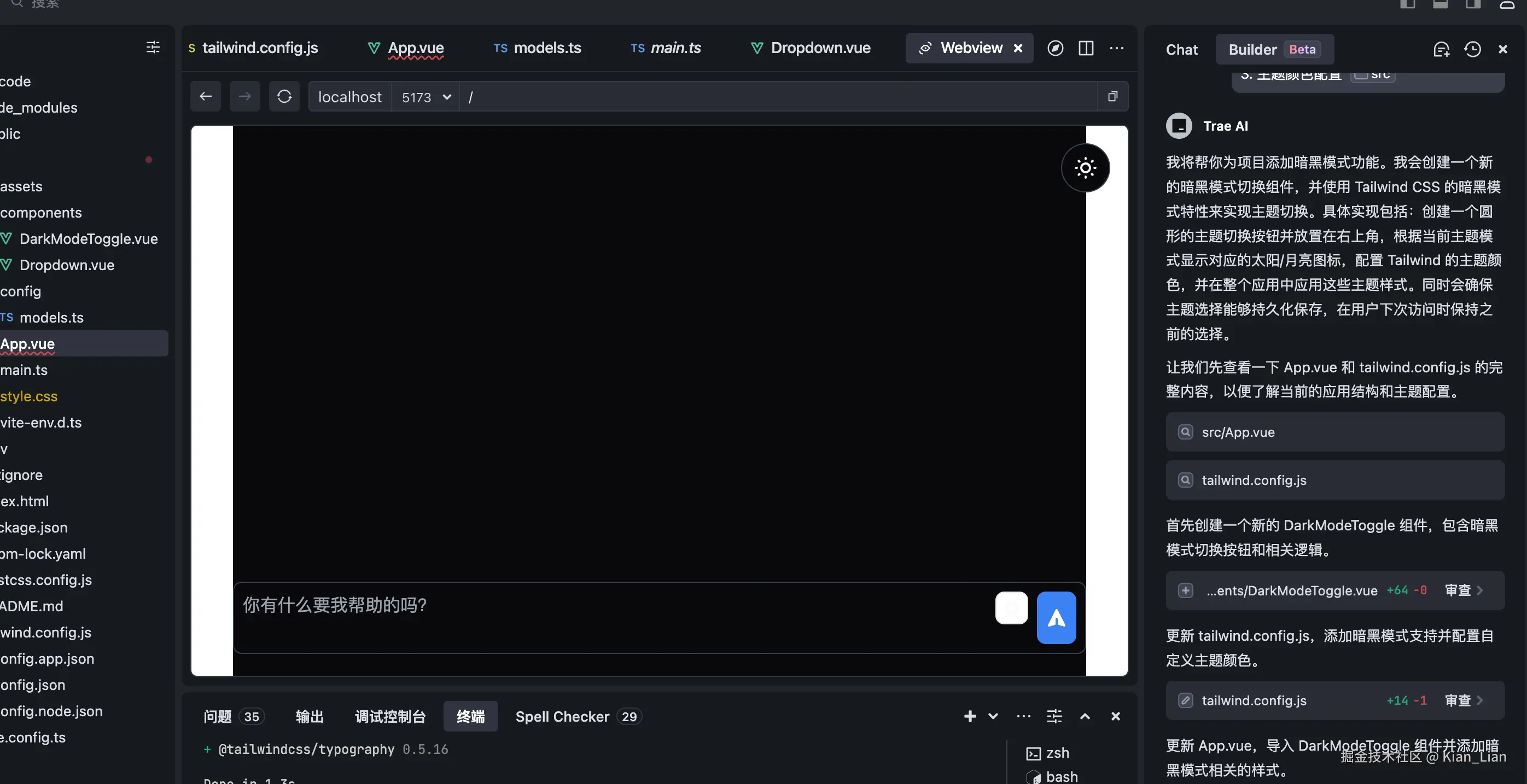 可能有时候AI修改的不太符合需求,比如在添加暗黑模式这一节,它成功添加了暗黑模式,并且可切换,但它修改了不相关的代码,导致布局错误。在这种情况下,我们可以选择拒绝本次修改,接着优化提示词,为AI提供更精确的需求,或者进行手动修改