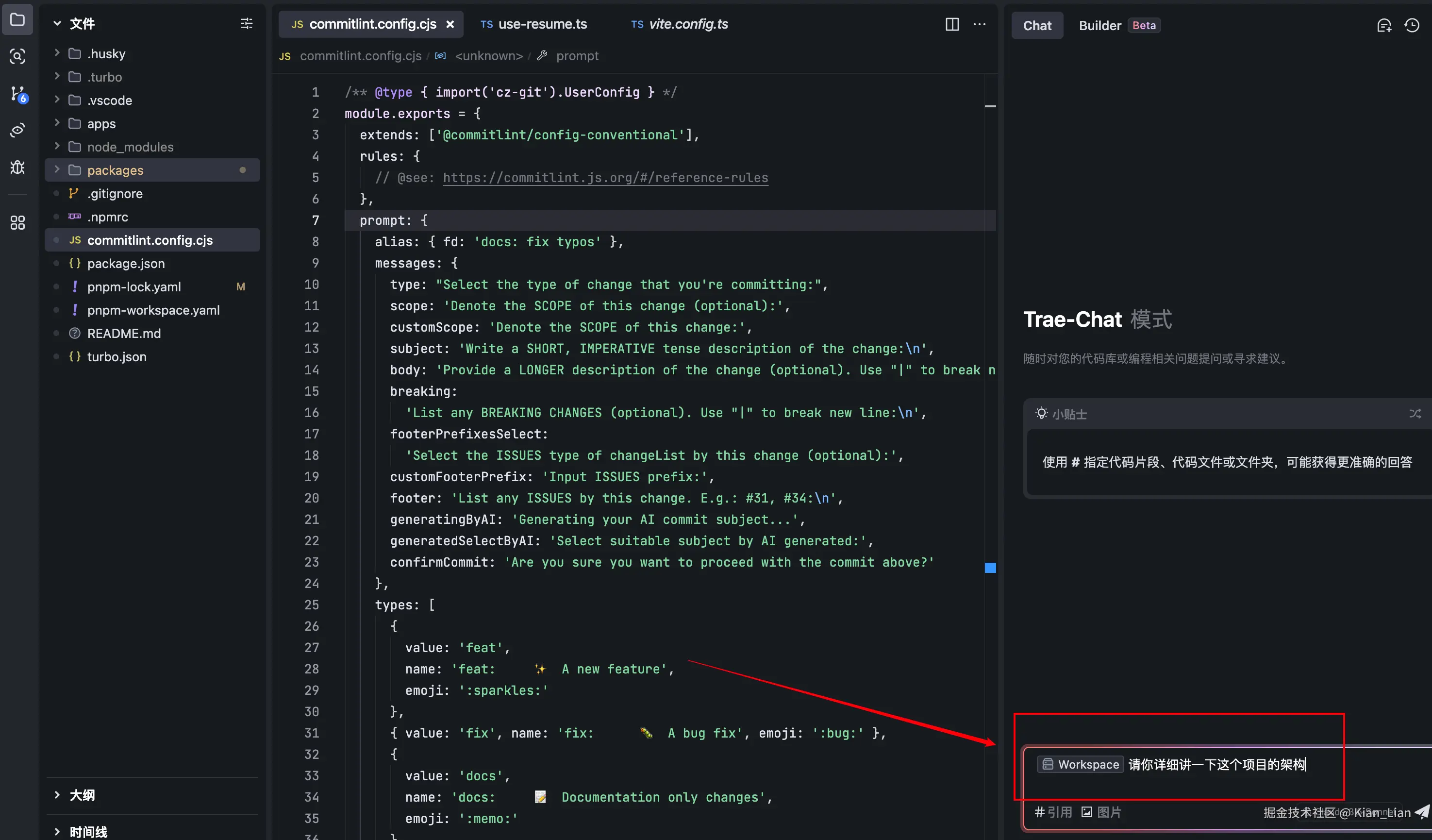 有时候从 GitHub 上拉取代码,如想学习项目源码、快速了解该项目等等,使用#workspace引用整个项目,结合 AI 提高你的学习效率