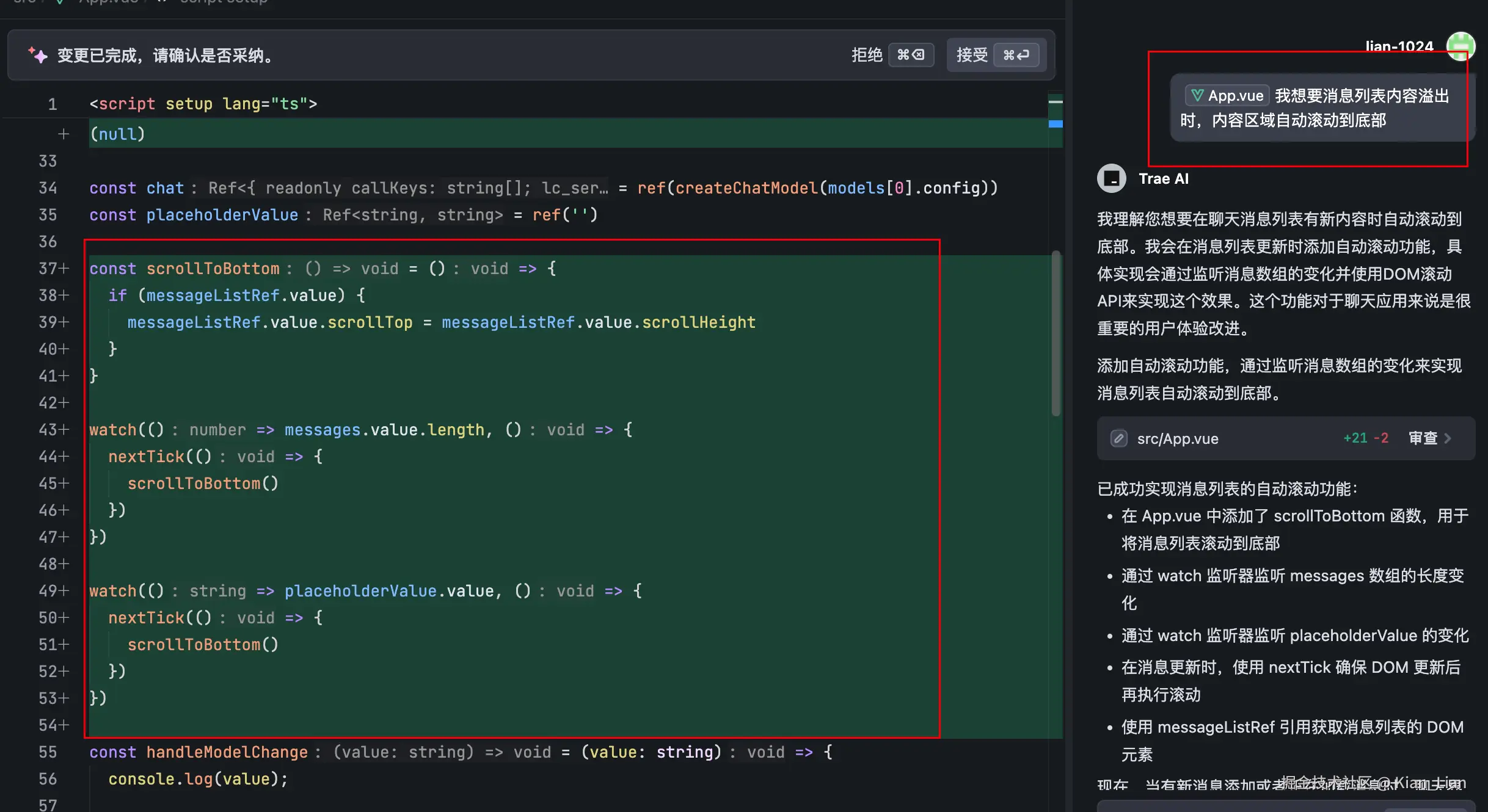 之后它会帮我创建一个scrollToBottom函数用于滚动到容器底部,并且在消息列表变化时调用该函数