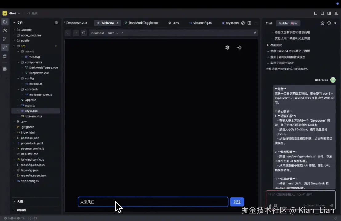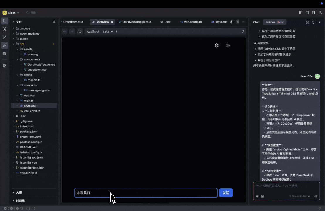 完美,如果在这实现的过程中有bug可以寻求ai,接下来给他上一点点难度,让它添加一个切换不同平台ai模型的dropdown