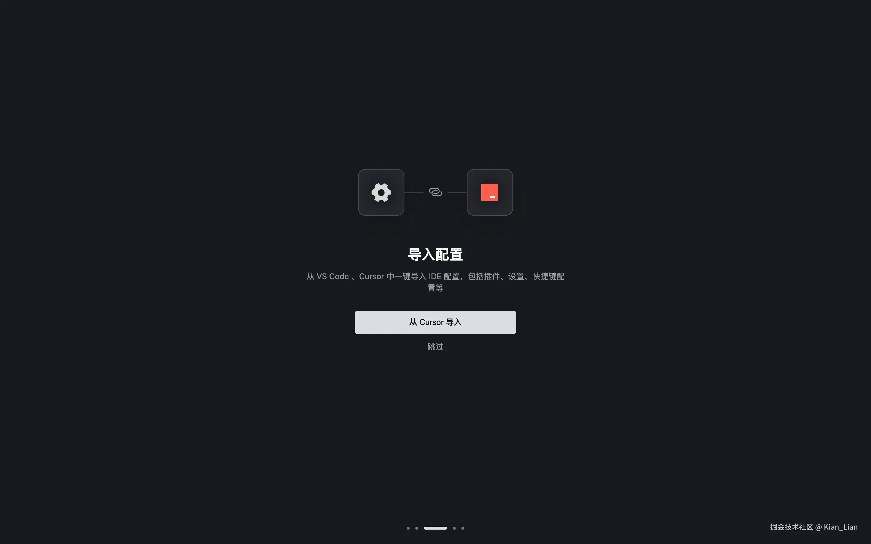 下载完后进入安装程序,它会让你选择主题以及语言,原生支持中文和英语,可以从其他IDE中导入数据如VSCode、Cursor等,它会将你的插件以及设置等一键导入Trae,这样你就可以轻松切换到Trae