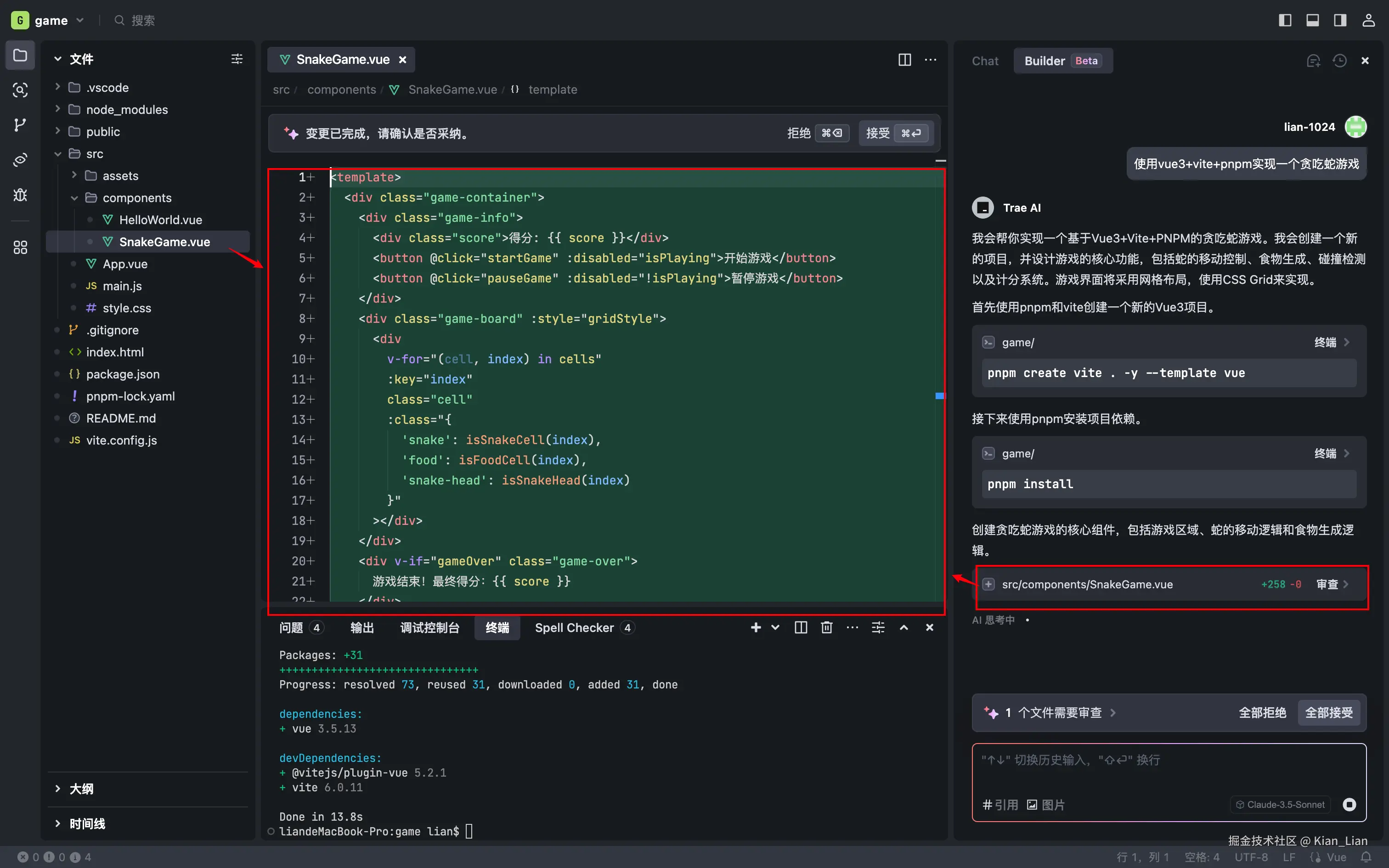把你的需求告诉它,比如让它使用 Vue 3 开发一个贪吃蛇游戏